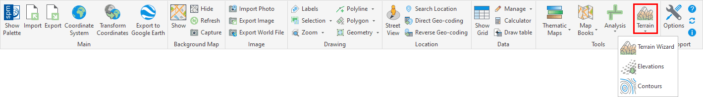 - 3 Terrain Wizard, which allows you to access the Terrain wizard in order to run one or more Terrain chained processes (obtain elevation 3D Points, and/or create Contours, and/or create Terrain 3D models, and/or project any Raster Image or Background Map to Terrains).