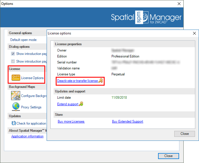 You can deactivate or transfer a license of Spatial Manager™ for ZWCAD by using the “Deactivate or transfer license” function, which can be found in the “License” section of the application options.